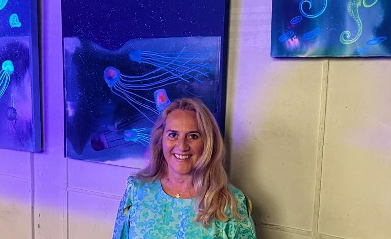 Interessata all’interazione tra la luce e il colore, nelle sue coniugazioni estetiche e percettive, Cristiana Fioretti dipinge sperimentando, osando sui materiali, e pigmenti, procedendo per stratificazione e contaminazione di tecniche e linguaggi. Nel 2015 con ‘Colormaps or spices’ al Mar – Museo Civico Archeologico di Ventimiglia e poi al SongYaFeng Centre di Pechino (curata da Jacqualine Ceresoli, storica e critica d’arte, raffinata e sensibile, docente universitaria e curatrice di mostre ) ha rielaborato mappe nautiche antiche e moderne di varie parti del mondo. con stratificazioni di acqua di mare mescolata a vari tipi di spezie : curry, curcuma zafferano e zenzero, erbe profumate, come anice, peperoncino, alloro, rosmarino, lavanda e molte altre ancora. Giungendo fino alle nuove tecnologie. Così Fioretti, dopo anni di opere , su tela o altre superfici con pittura a olio e acrilico,, sculture e stratificazioni polimateriche, s’interessa di black light art, la lampada di Wood, conosciuta anche come luce nera (scoperta dal fisico americano Robert William Wood nel 1913) La luce che colora il buio. illuminate dai raggi ultravioletti della lampada, le opere, dipinte con pigmenti speciali reattivi, sembrano emergere dal buio e si illuminano di bagliori fosforescenti e fluorescenti, con un effetto sorprendente. Come le meduse esposte in via Fiori Chiari, diafane e poetiche, luminose nella fluorescenza che si imprimono nella memoria. E in mezzo a quella luce che colora il buoi sembrano fluttuare nello spazio infinito senza tempo.